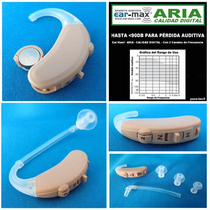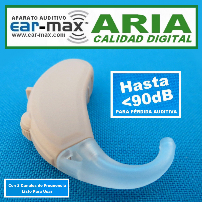 Ear Max® ARIA - CALIDAD DIGITAL - Aparato Auditivo Auxiliar - Estilo Curveta es un auditivo análogo de alta calidad que le brinda un sonido fuerte y claro. Ear Max® ARIA - CALIDAD DIGITAL es tan fuerte que está diseñado para pérdida auditiva leve a severa, hasta <90dB