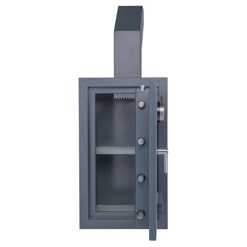 Caja fuerte de alta seguridad fabricada en acero calibre 20 exterior y 18 interior. Rellena de aislante térmico de concreto reforzado haciéndola resistente al fuego. Barras de contramarco resistentes a ataques en las bisagras exteriores.