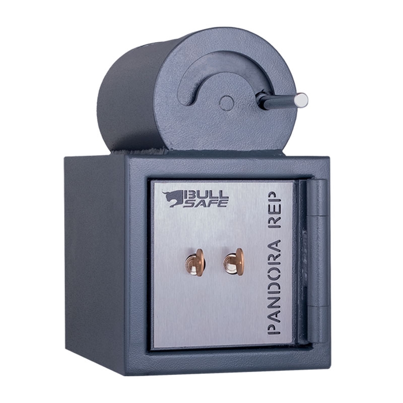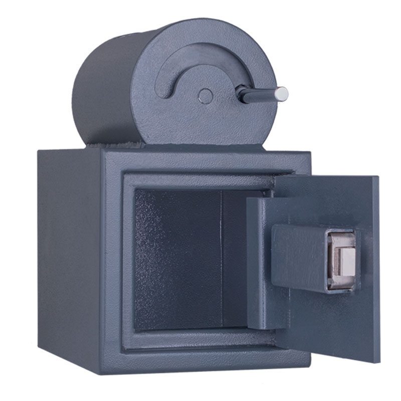 Diseñada con sistema de buzón rotativo en la parte superior de la caja, lo cual permite depositar el efectivo discretamente, además de la seguridad que le brinda contar con cerradura de llave de alta seguridad. Cuenta con cuatro orificios en el interior para atornillarse fácilmente al vehículo, la pintura es anticorrosiva de textura corrugada de color gris medio.