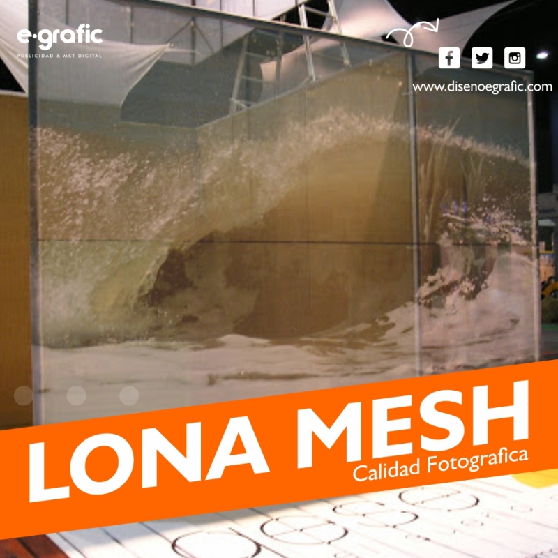 La lona mesh tiene la caracteristica de ser un lienzo con microperforaciones, eso la hace mas ligera permite el paso de la luz y aire, la base de esta tela espoliester.