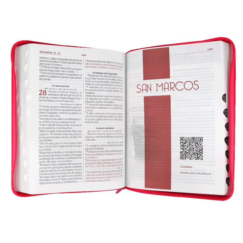 Cubierta elegante y sobria, diseño atractivo, de fácil lectura, palabras de Jesús en rojo, las dos cintas separadoras permiten guardar varios temas a la vez, ayudas especiales que apoyan el conocimiento, entendimiento e interacción con la Palabra.