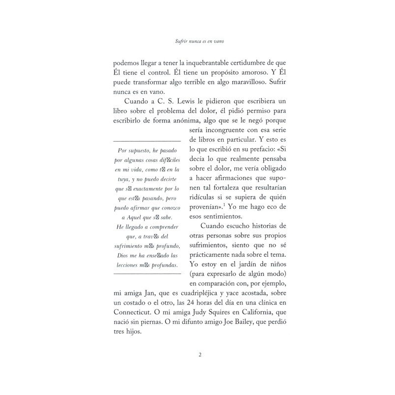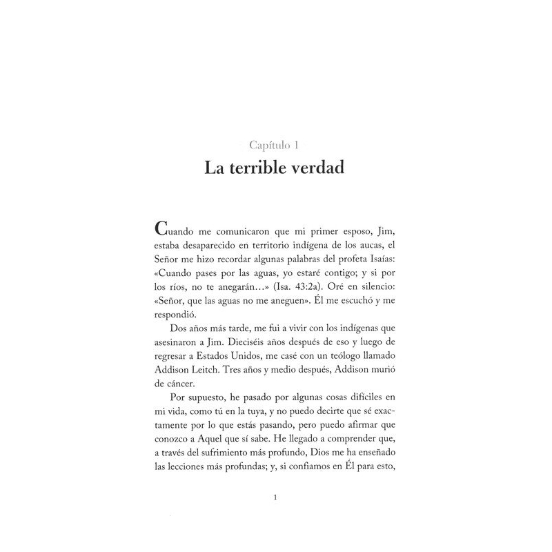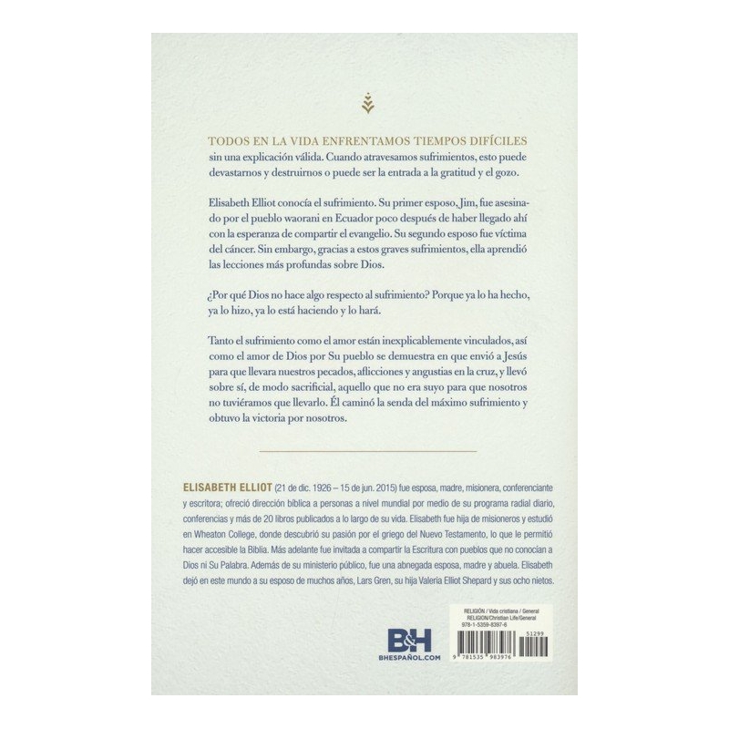 En la vida los tiempos difíciles nos llegan a todos, sin ninguna explicación real. Pasar por el sufrimiento tiene el potencial de devastarnos y destruirnos, o de ser una puerta de entrada a la gratitud y la alegría. Elisabeth Elliot no era ajena al sufrimiento. Su primer marido, Jim, fue asesinado por la gente Waoroni en Ecuador, momentos después de que él llegara con la esperanza de compartir el evangelio. Su segundo marido lo perdió por el cáncer. Sin embargo, fue en su sufrimiento más profundo que aprendió las lecciones más profundas acerca de Dios. ¿Por qué no hace Dios algo con el sufrimiento? Él hace, Él hizo, Él es, y Él lo hará. El sufrimiento y el amor están inexplicablemente vinculados, como lo demuestra el amor de Dios por su pueblo en el hecho de que envió a Jesús a cargar nuestros pecados, aflicciones y sufrimientos en la cruz, y llevó lo que no era suyo para que no tuviéramos que llevarlo nosotros. Él ha recorrido el último camino del sufrimiento, y ha ganado la victoria en nuestro nombre. Esta verdad llevó a Elisabeth a decir: "Lo que sea que esté en la copa que Dios me está ofreciendo, ya sea dolor, pena y sufrimiento, y pena junto con muchas más alegrías, estoy dispuesta a aceptarlo porque confío en Él".