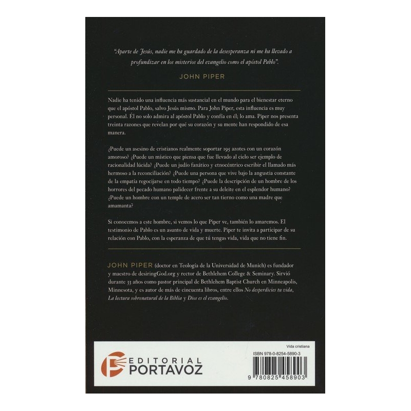 En Por qué amo al apóstol Pablo, John Piper reflexiona sobre el ministerio de este famoso perseguidor convertido en misionero, recurriendo a las seis décadas que ha pasado "conociendo" a Pablo a través del Nuevo Testamento, que registra su conversión, viajes misioneros y 13 cartas que escribió a iglesias en todo el mundo antiguo. Ofreciendo a los lectores 30 razones por las cuales Piper ama al apóstol Pablo, este libro de meditaciones cortas sobre la maravilla del evangelio, la perseverancia a través del sufrimiento, el amor a los incrédulos y la obra de Dios a través de la debilidad alentará a los lectores a imitar el ejemplo de confianza inquebrantable de Pablo en la gracia y el amor de Dios hacia los demás.