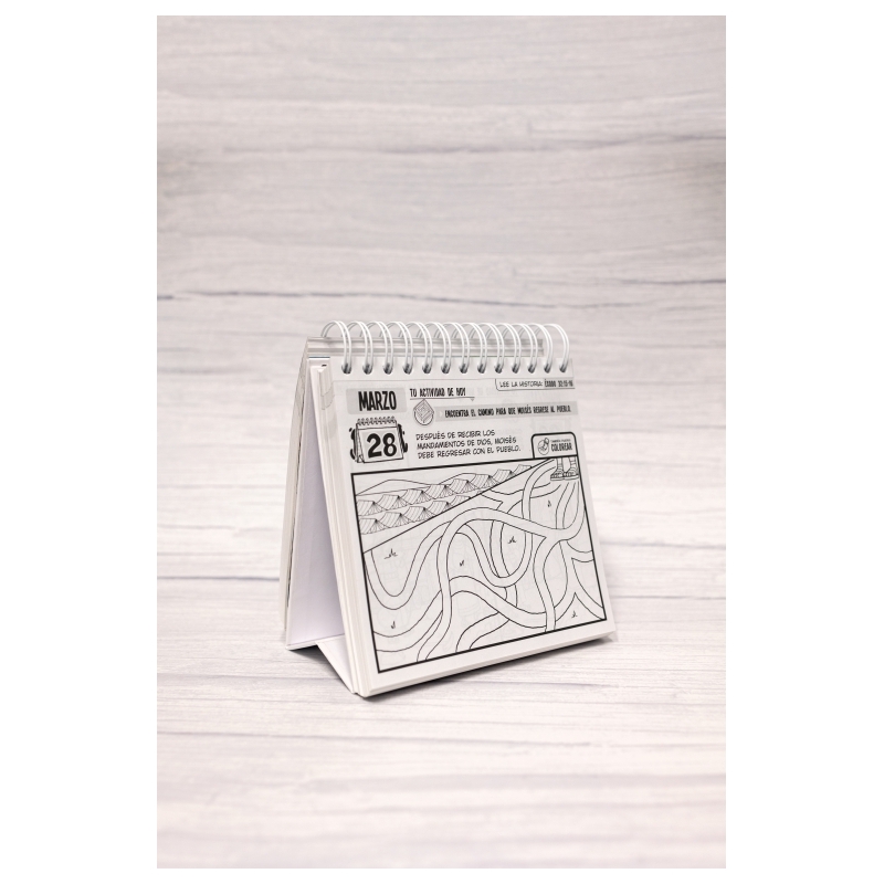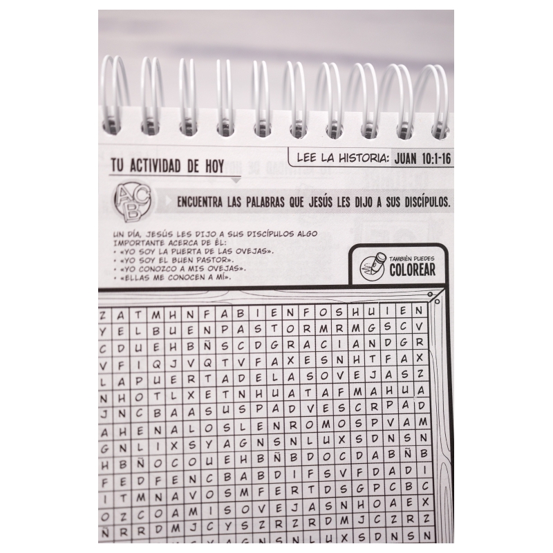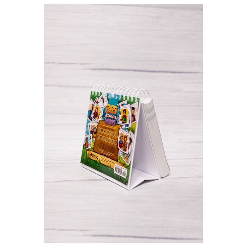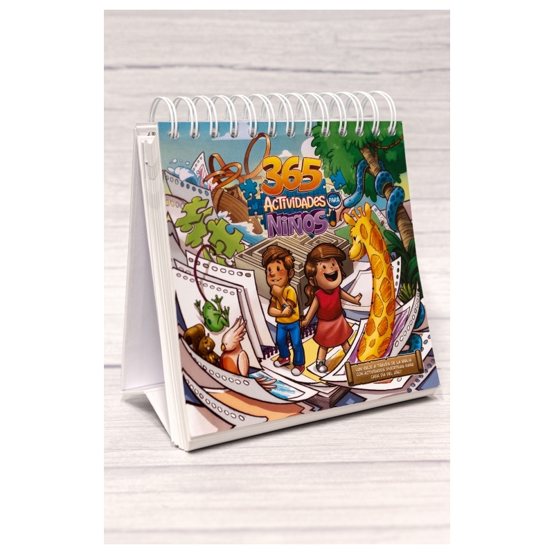 La nueva versión de 365 actividades para niños presenta las nuevas y bellas ilustraciones de las historias bíblicas, desde Génesis hasta Hechos de los Apóstoles. El producto está encuadernado en espiral para voltear las páginas fácilmente, y tiene un soporte integrado que lo mantiene firme sobre cualquier superficie. A través de los dibujos para colorear, los niños aprenderán sobre las historias de la Biblia de una manera divertida, pudiendo comenzar en cualquier momento del año. Este librito de actividades, incluye: