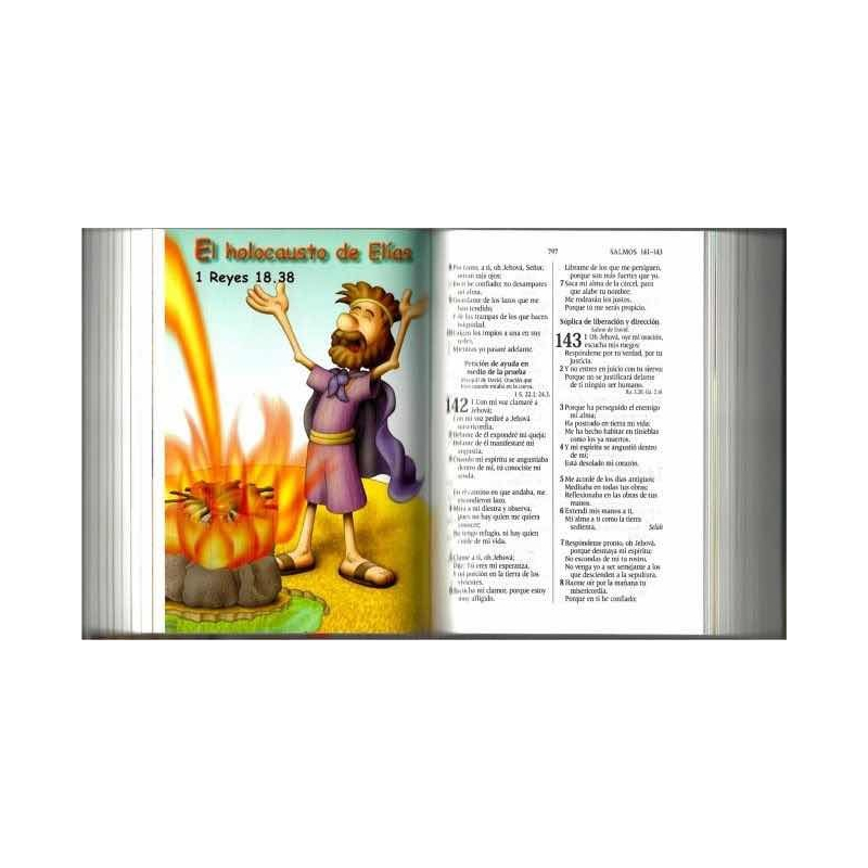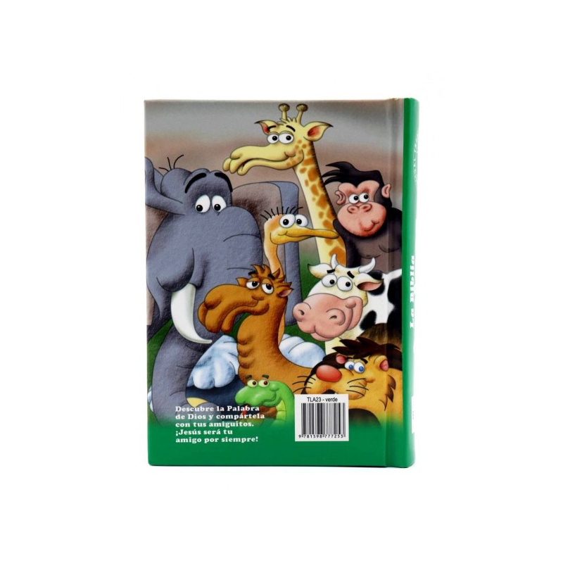 Biblia para niños en versión TLA. Contiene 48 imágenes a color, índice de abreviaturas, glosario, mapas, ayudas para el lector (pasajes referentes al perdón de Dios, lecturas para días especiales, cómo leer la Biblia y una descripción de cada libro de la Biblia). También contiene página para dedicatoria y para anotar fechas importantes. Variedad de colores: naranja y verde