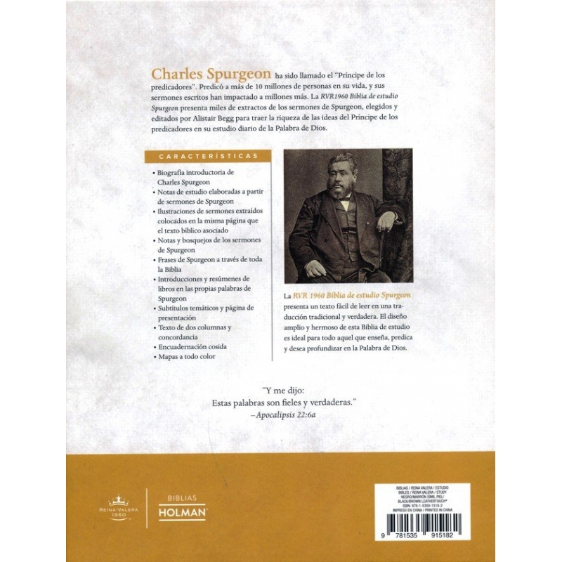 Charles Spurgeon ha sido llamado el "Príncipe de los Predicadores". Predicó a más de 10 millones de personas en su vida, y sus sermones escritos han impactado a millones más. La Biblia de Estudio Spurgeon RVR 1960 presenta miles de extractos de los sermones de Spurgeon, elegidos y editados por Alistair Begg para traer la riqueza de las ideas del Príncipe de los Predicadores en su estudio diario de la Palabra de Dios.