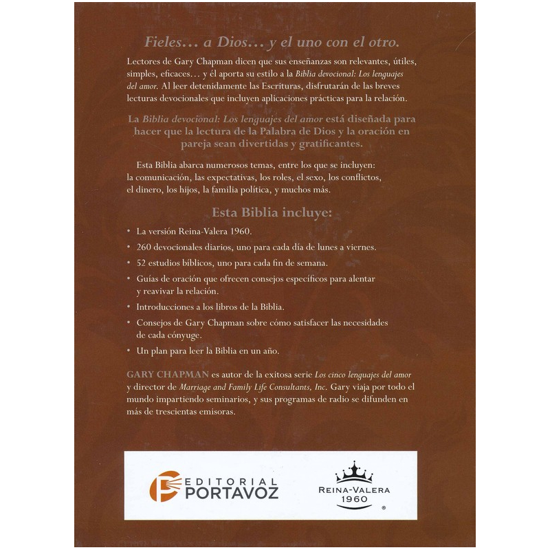 Fieles... a Dios... y el uno con el otro. Lectores de Gary Chapman dicen que sus enseñanzas son relevantes, útiles, simples, eficaces... y él aporta su estilo a la Biblia devocional: Los lenguajes del amor. Al leer detenidamente las Escrituras, disfrutarán de las breves lecturas devocionales que incluyen aplicaciones prácticas para la relación.