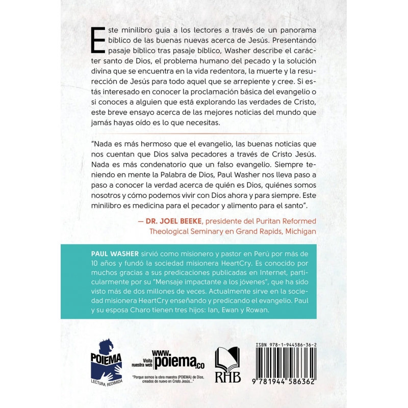 Presentando pasaje bíblico tras pasaje bíblico, Washer describe el carácter santo de Dios, el problema humano del pecado y la solución divina que se encuentra en la vida redentora, la muerte y la resurrección de Jesús para todo aquel que se arrepiente y cree. Si conoces a alguien que está explorando las verdades de Cristo, este breve ensayo acerca de las mejores noticias del mundo que jamás hayas oído es lo que necesitas.