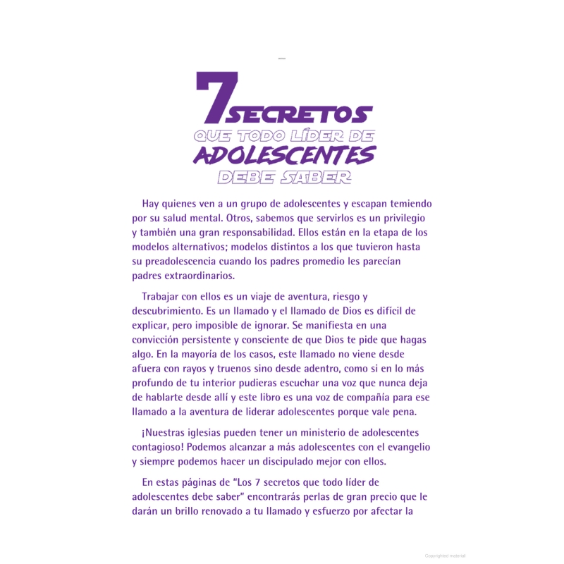 Hay quienes ven a un grupo de adolescentes y escapan temiendo por su salud mental. Otros, sabemos que servirlos es un privilegio y también una gran responsabilidad. Ellos están en la etapa de los modelos alternativos; modelos distintos a los que tuvieron hasta su preadolescencia cuando los padres promedio les parecían padres extraordinarios. Trabajar con ellos es un viaje de aventura, riesgo y descubrimiento. Es un llamado y el llamado de Dios es difícil de explicar, pero imposible de ignorar. Se manifiesta en una convicción persistente y consciente de que Dios te pide que hagas algo. En la mayoría de los casos, este llamado no viene desde afuera con rayos y truenos sino desde adentro, como si en lo más profundo de tu interior pudieras escuchar una voz que nunca deja de hablarte desde allí y este libro es una voz de compañía para ese llamado a la aventura de liderar adolescentes porque vale pena.