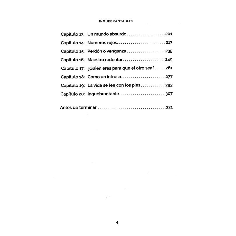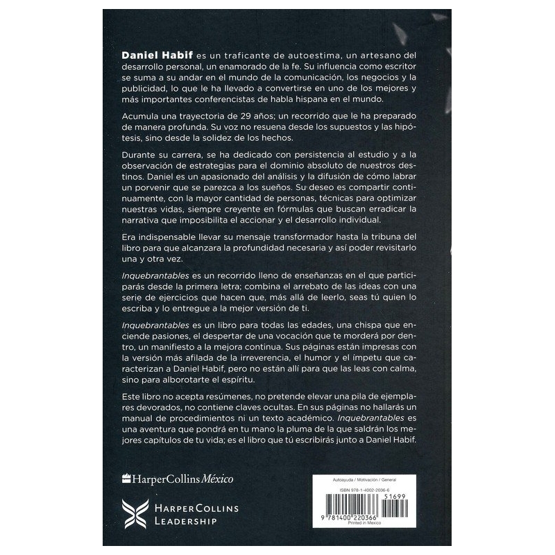Inquebrantables reúne y expande los mensajes de inspiración que mayor impacto han tenido y que mejor representan a Daniel Habif como orador motivacional, e inspiran al lector a mirar más allá de sus circunstancias actuales para crear la vida que desean vivir. Este es un libro que no acepta resúmenes. No forma parte de los títulos que tachas y vas a otra cosa. No es un trofeo, ni un manual de procedimientos. No es una tesis, ni un texto académico. Si tu intención es pasar por él sin dejar que él lo haga por ti, no servirá de nada. El dinero lo podrás recuperar, pero te advierto que el tiempo se habrá ido para siempre. Su belleza no está en las palabras que yo escribí, sino en las que tú generes con él. Está compuesto de mil pedazos míos, trozos sueltos de mi alma y de mi carne: un alcázar edificado con todas las piedras que me han lanzado, una diadema confeccionada con las perlas que he recibido. Hallarás soledades y alegrías, anhelos y zozobras, inquietudes y esperanzas, clamores y murmullos. No fue fácil desprenderme de ellos. -Daniel Habif (tomado de la introducción del libro)